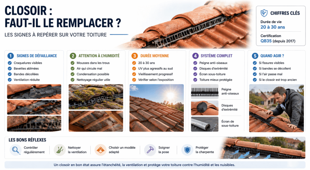 Un autre signe de défaillance est l’encrassement : si les trous de ventilation sont bouchés par des mousses ou de la poussière, l’air ne circule plus. En général, on estime la durée de vie d’un closoir entre vingt et trente ans. Si votre toiture atteint cet âge, un petit diagnostic visuel s’impose pour éviter des dégâts invisibles sur votre charpente. 🔍